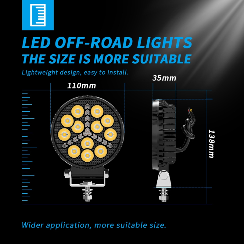 | Specifications Power:19W LM:3600Lm Material:Aluminum Voltage:9-36V LED Chips:3030 Number of LEDs:12 Color Temperature:6500K LifeSpan:30000H IP Rating:IP68 Light Type:Spot Light Color:White+Amber Beam | Packaging Information Product Weight:490g Inner Box Size:130×130×65mm Outer Box Size:68×27.5×32cm Packing Type:Neutral color box Quantity Per Carton:50PCS |