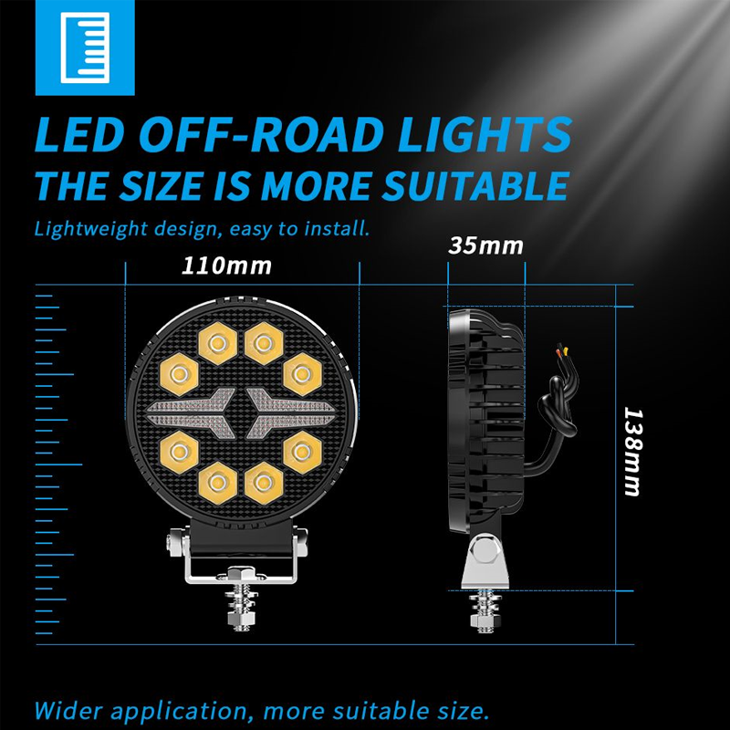 | Specifications Power:20W LM:1600Lm Material:Aluminum Voltage:9-36V LED Chips:3030 Number of LEDs:8 Color Temperature:6500K LifeSpan:30000H IP Rating:IP68 Light Type:Spot Light Color:White+Amber Beam | Packaging Information Product Weight:450g Inner Box Size:130×130×65mm Outer Box Size:68×27.5×32cm Packing Type:Neutral color box Quantity Per Carton:50PCS |