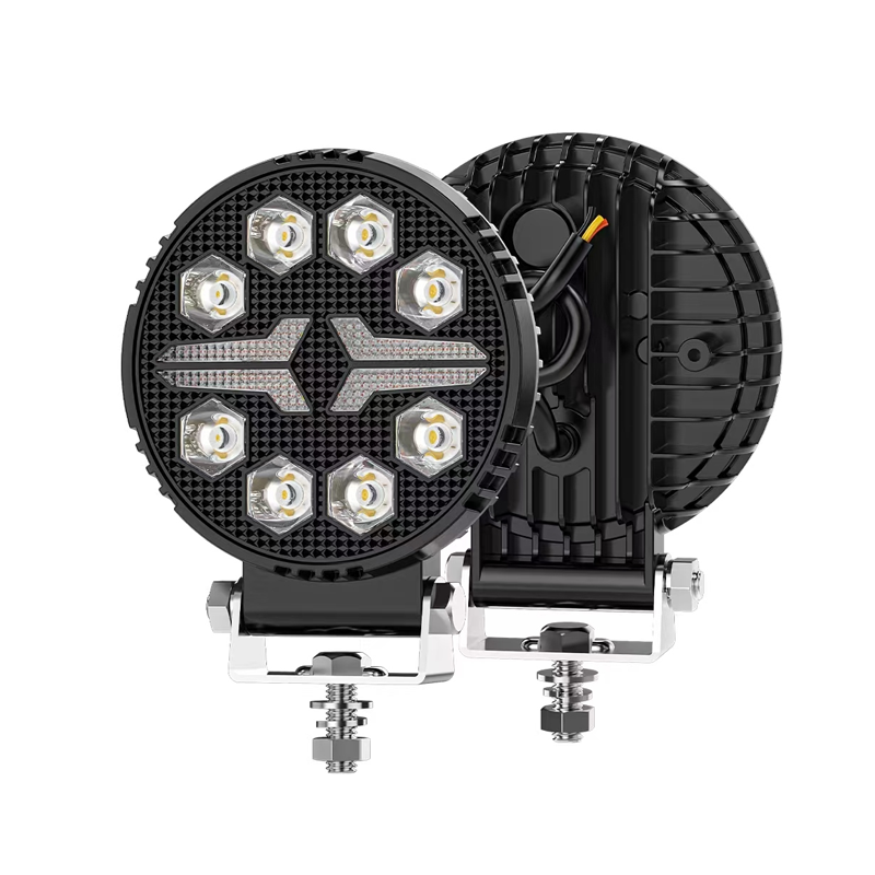HY-GD2032 - Premium 4" round LED work lights with durable aluminum housing, featuring versatile 9-36V operation. These IP68 waterproof spotlights offer white/amber dual-color illumination for enhanced visibility, perfect for off-road vehicles, trucks, boats and agricultural equipment needing powerful flood lighting in challenging conditions.