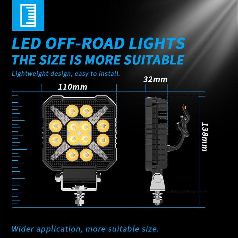 HY-GD2033 - Rugged square-shaped 4-inch LED driving lights built with heavy-duty aluminum construction. It provide both white and amber lighting options, designed for SUVs, ATVs, work trucks and marine applications requiring dependable 9-36V illumination.